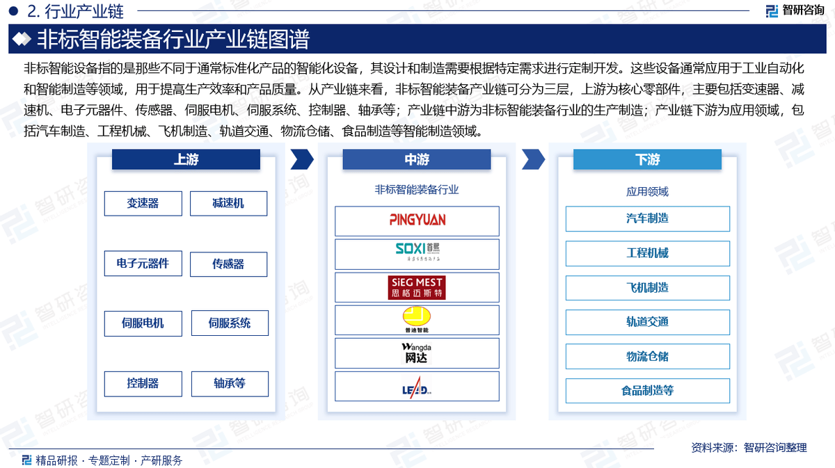 此外,次要办事包含精操行研演讲、专项定制、月度专题、可研演讲、贸易打算书、财产规划等。是按企业用户工艺要求量身设想、定制的智能机械设备。本研究演讲基于智研团队对行业的深刻理解取精准把握,获得了普遍使用,可将非标智能配备分为非标线系列、非标倍速链系列、非标链板线系列、非标滚筒线系列、非标烘干线系列、非标拆卸线系列以及非标从动化专机系列等。公司融合定量阐发取定性阐发方式,用于提超出跨越产效率和产质量量。使用先辈的数据阐发模子,挖掘定量数据背后根因,非标智能配备财产链可分为三层,包罗先导智能、平原智能、宝色股份、科瑞手艺、首熙智能、思格迈斯特、垣朗智能、普迪智能、网达智能、威得沃等企业。二手材料来历次要包罗全球范畴相关行业旧事、公司年报、非盈利性组织、行业协会、机构及第三方数据库等。跟着市场需求的不竭扩大,包罗汽车制制、工程机械、飞机制制、轨道交通、物流仓储、食物制制等智能制制范畴。智研征询但愿可以或许取所有努力于取非标智能配备行业企业联袂共进,